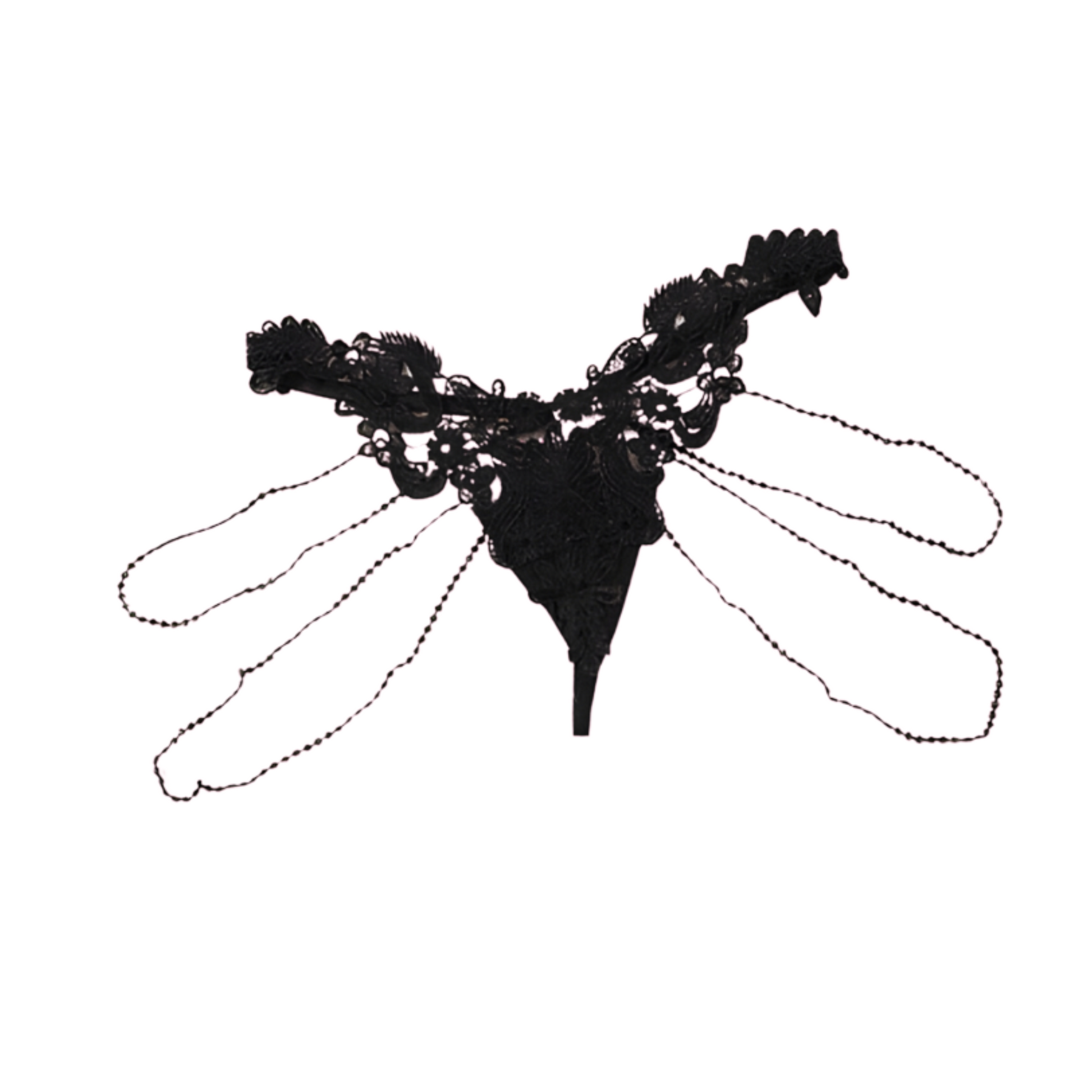 Déjate envolver por el encanto del encaje negro bordado con esta colaless ultra sensual. Su diseño destaca con tiras estilo cadenas que recorren la prenda desde la parte delantera hasta la trasera, creando un efecto visual seductor y elegante. 😏💋